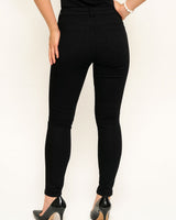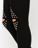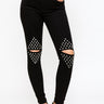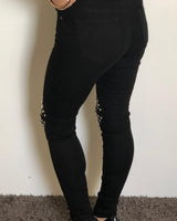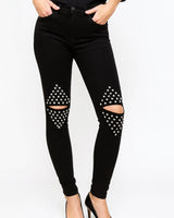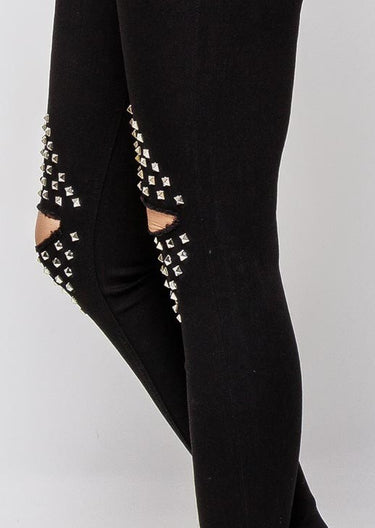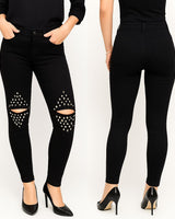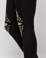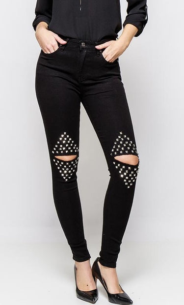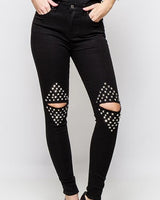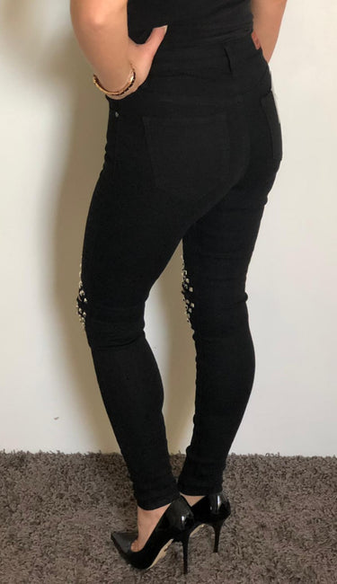 Melnas džinsu bikses ar caurumiem un spaikiem ceļgalu zonā.