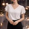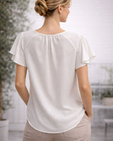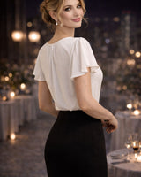Izsmalcināta balta blūze ar vieglām, krītošām piedurknēm, kas piešķir tēlam sievišķīgu eleganci. Lieliski piemērota vakara pasākumiem, svinīgām vakariņām vai īpašiem notikumiem. Skaisti kombinējas gan ar klasiskām biksēm, gan svārkiem, radot modernu un izkoptu stilu.
