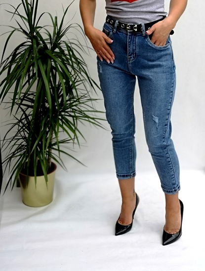 boyfriend tipa džinsu bikses ar dekoratīvu jostiņu.