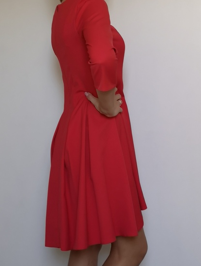 Sarkana kleita 3/4 piedurknēm un pagarinātu aozmugurējo daļu.