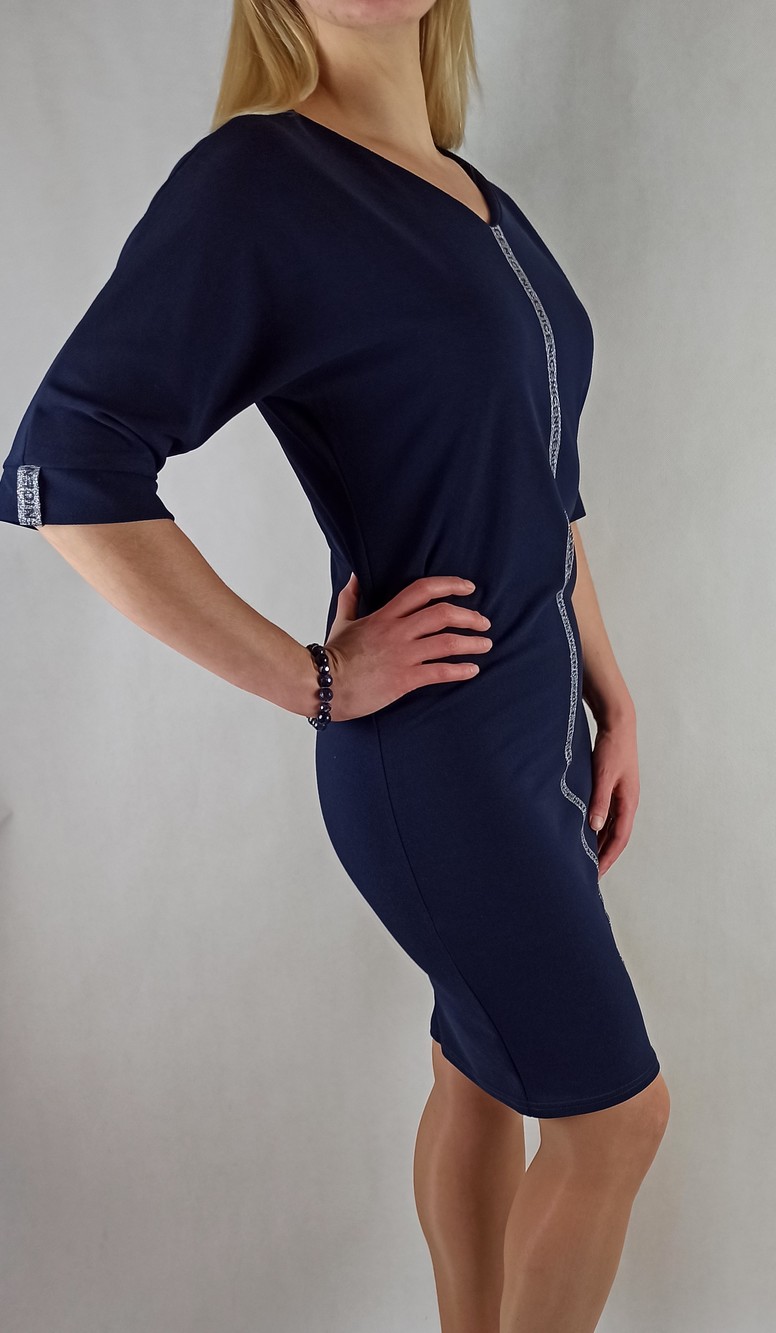 Tumši zila, taisnā kleita ar sudrabotu, vertikālu vārdu NICE rindu.