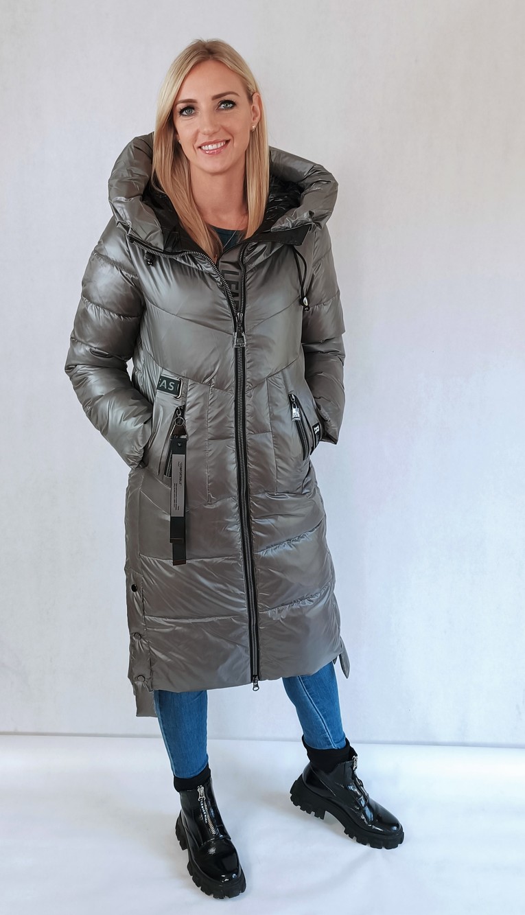 Sudrabkrāsas, silts ziemas mētelis ar melnas krāsas elementiem. Mētelis ir aizverams ar rāvējslēdzēju. Apakšdaļas sānos ir nelieli šķēlumi ar spiedpogām. Piedurkņu galu iekšpusē ir iestrādāta rievota trikotāžas gumija. Pildījums - sintepons.