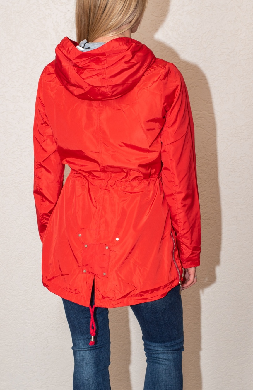 Sarkana pavasara/vasaras virsjaka ar kapuci, kabatām un iespēju pievilkt vidukļa zonu, odere daļēji (kapuse un šalles zona) pievienota ar rāvējslēdzējiem, ko iespējams noņemt.